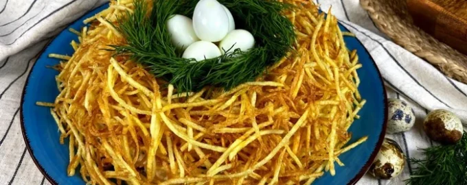 फोटो: खुले स्रोतों से यह सुंदर और स्वादिष्ट सलाद छुट्टियों की मेज के लिए बिल्कुल उपयुक्त है। मूल सलाद “गिल वुड ग्राउज़ नेस्ट”